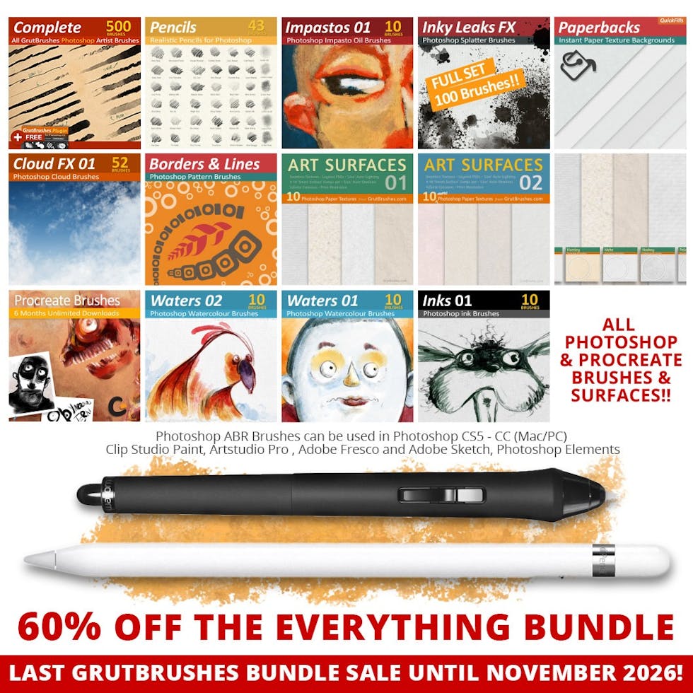 Over 650 Photoshop brushes in total + 16 PaperBack QuickFills + 24 HD Smart Art Surfaces plus more than 160 Procreate brushes and 10 Procreate Art Surfaces. Over 2 Gigabytes worth of digital goodies so you can create until your fingers go numb!